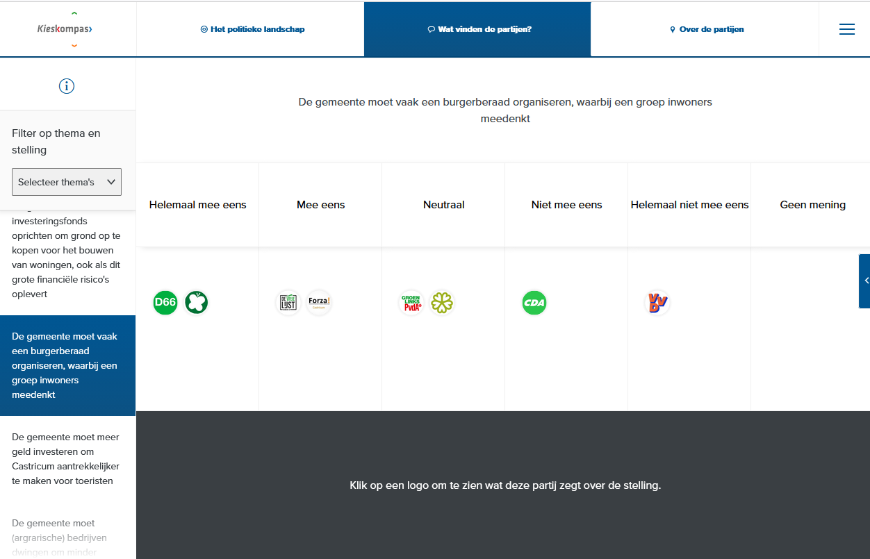- Het lijkt alsof de inzichten van de politieke partijen bij deze vraag niet goed zijn meegenomen. Bijvoorbeeld als je klikt op de uitleg voor Groenlinks-PvdA lees je als toelichting een heel lang verhaal dat niet over burgerberaden gaat. Terwijl ze in het verkiezingsprogramma wel iets zeggen over dit onderwerp (p. 17).
